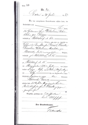 Heinrich Wilhelm Ladage hatte den Beruf ein unbekanntes Datum Exten; Messerschmied. Er ist geboren am 7 Januar 1859 in Nr.83, Exten. Er ist getauft am 23 Januar 1859 in Cosmae et Damiani Kirche, Exten. Er heiratet Caroline Friederike Auguste Wolter, Tochter von Adolf August Wolter und Friederike Wilhelmine Dorothee Dreier, am 17 Oktober 1886 in Cosmae et Damiani Kirche, Exten. Standesamtlich sind Heinrich Wilhelm Ladage und Caroline Friederike Auguste Wolter getraut am 17 Oktober 1886 in Exten.