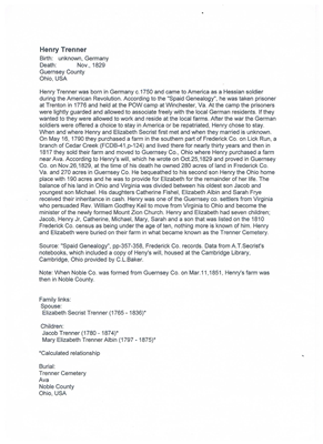 Henry Trenner ist geboren am 28 Oktober 1790 in Frederick County, USA. Er heiratet Sarah Frye, Tochter von John Frye und Mary Collins, am 30 April 1818. Er stirbt an am 4 Februar 1882 in Valley Township, Guernesey County, Ohio, USA, im Alter von 91.